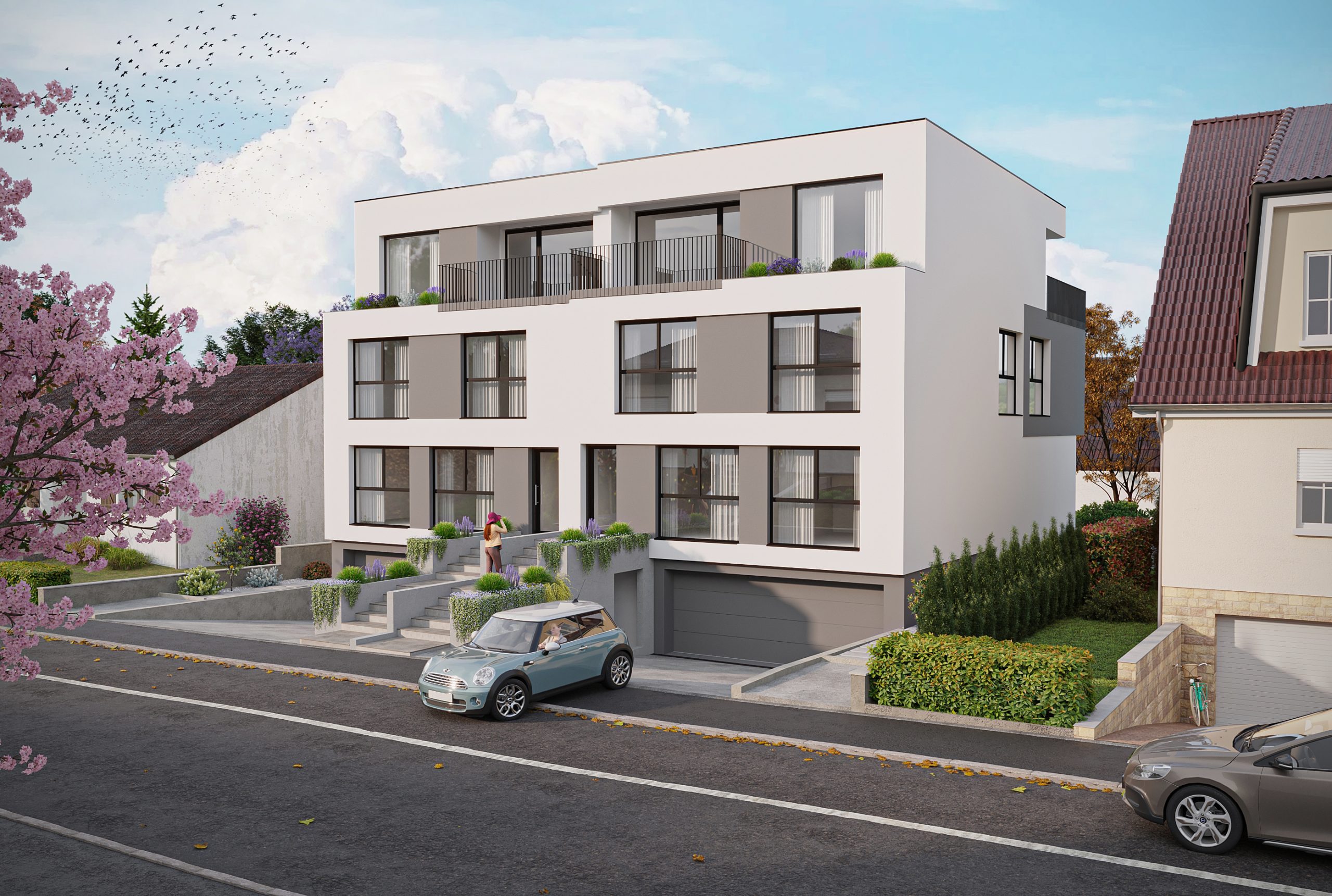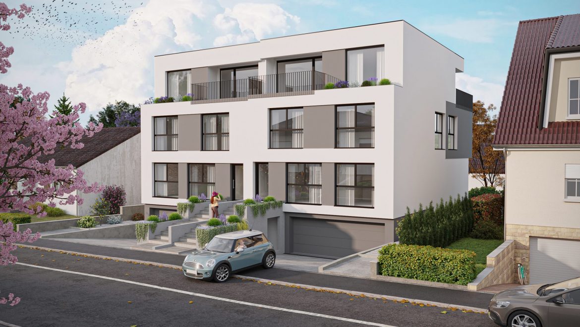 For sale in Olm commune of Capellen, rue Zinnen, a project for two two-family houses, including a B1 duplex of 133.54 m2 comprising: