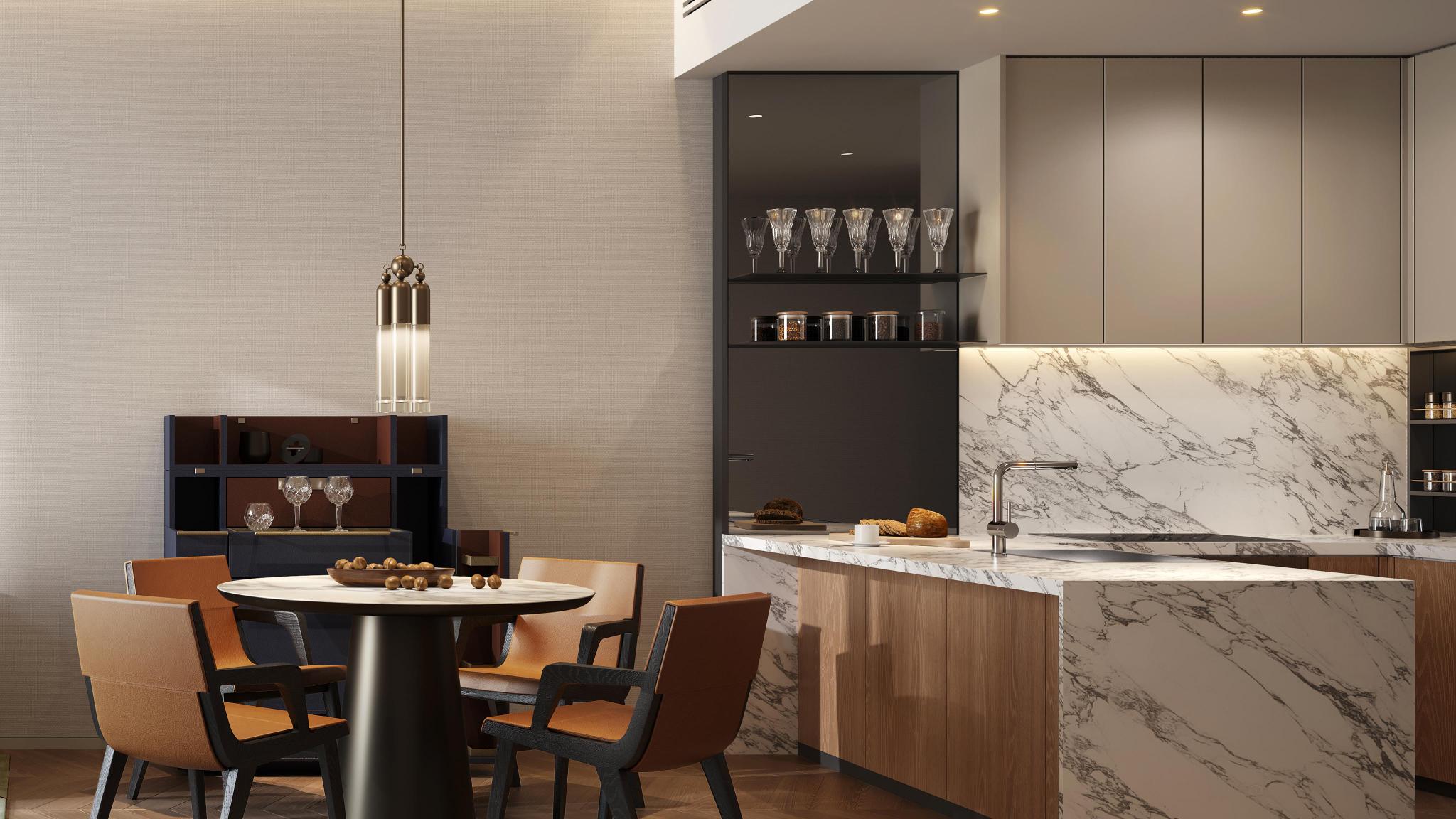 Designed for a discerning clientele, the residences offer a refined living environment, combining contemporary design and noble materials: premium marble, wood finishes, large picture windows and panoramic views of the Burj Khalifa, the Downtown Dubai skyline and the Persian Gulf.